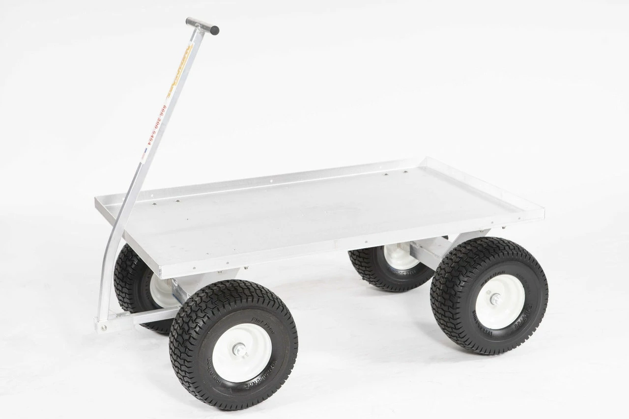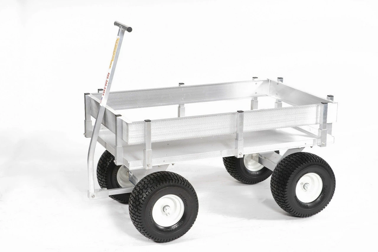 *This item is oversized and is excluded from free shipping offers. Shipping times may vary. *Assembly not included. Contact [email protected] for details.-With reinforced 2" raised undercarriages to allow the 13" large tread monster turf tires to glide easily over any rough terrain. -The wagon deck stands 15" from the ground. -The Jupiter boasts a heavy duty 1/8" thick solid 27" by 45" aluminum bed. The 1 1/2" perimeter lip keeps your load secure in the wagon bed. The solid deck has drain holes in all four corners to prevent standing water build up. -An easy to grip "T" pull handle is easily removable with a curved design allowing the handle to stay upright when stationary. This eliminates the risk of anyone tripping over the handle while the wagon is not in use. -Its commercial grade aluminum welded fabrication allows the Jupiter to withstand the harshest conditions and extremely heavy loads. -Ideal for hauling oversize coolers, fishing & camping gear, feed & hay, water tanks, sporting equipment, tools & machinery, generators, construction materials/debris"¦ The uses are endless. -The Jupiter Wagon is perfect for all commercial, industrial or residential needs. -Garden centers can load and haul fifteen 3-gallon containers. -Rust-free and corrosion resistant! -Stainless steel nuts and bolts. -Pneumatic tires load capacity up to 1,200 lbs. Weighs 64 lbs. -Made in the USA