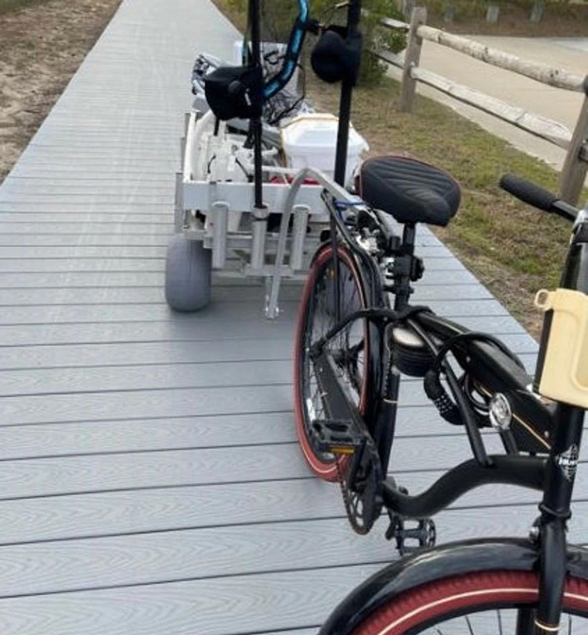 This bike attachment will change the way you head to the beach. Simply remove your pull handle from your wagon and replace with the bike attachment. Tighten the bike clamp onto your bike seat post and attach the safety strap. Fabricated with heavy duty aluminum 1" tubing and built to last For use with any Big Kahuna, Kahuna Junior, Calypso Cruiser, Sidekick, Pull wagon, Little Hercules, Jupiter wagon, Cypress Wagon and Cypress Junior Wagon
