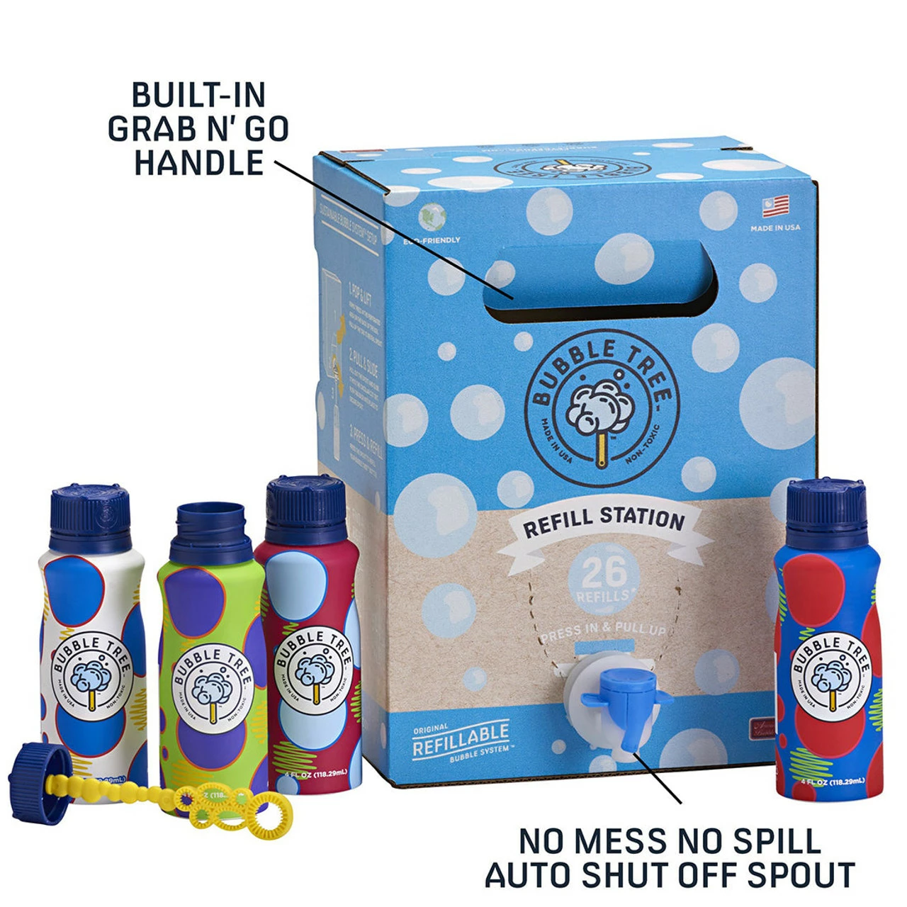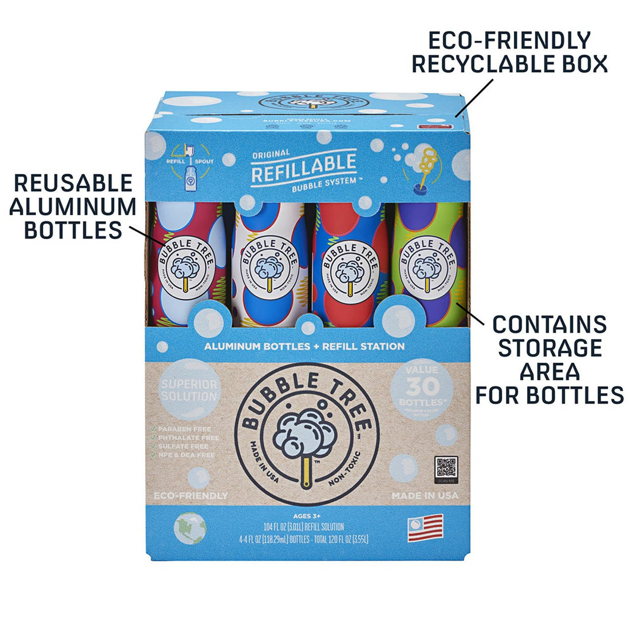 Bubble tree 3 liter bubble system comes with a 3 liter non toxic bubble solution and 4 pre-filled bottles, these bottles are made from aluminum that can be recycled. Also these bottles can be refilled and reused for hours of fun. Features 2 pre-filled Bubble Bottles made from 100% recyclable Aluminum that can be refilled 1 liter of Eco-friendly non-toxic superior bubble solution. Enough for up to 8 additional refills Dispensing refill spout included on back to refill bottles Custom design wand affixed on all bottle caps Original Bubble Tree„ patent pending design and systems Made from sustainable packaging that is 100% recyclable Includes storage area to store aluminum bottles Can be used to refill other bubble toys Handle on back every of box Ages 3+ Use all year around. Bubble Tree Original Refillable system is not just safe for the environment but safe for you too. Get rid of one time use plastic bottles. Reuse! Refill! Recycle and Share! This item features 3 Liter of eco-friendly superior bubble solution and 4 aluminum bottles that can be refilled. This can also be used with our other featured product so Grab N"™ Go and take this to your next celebration, event or just have fun with your family and friends!