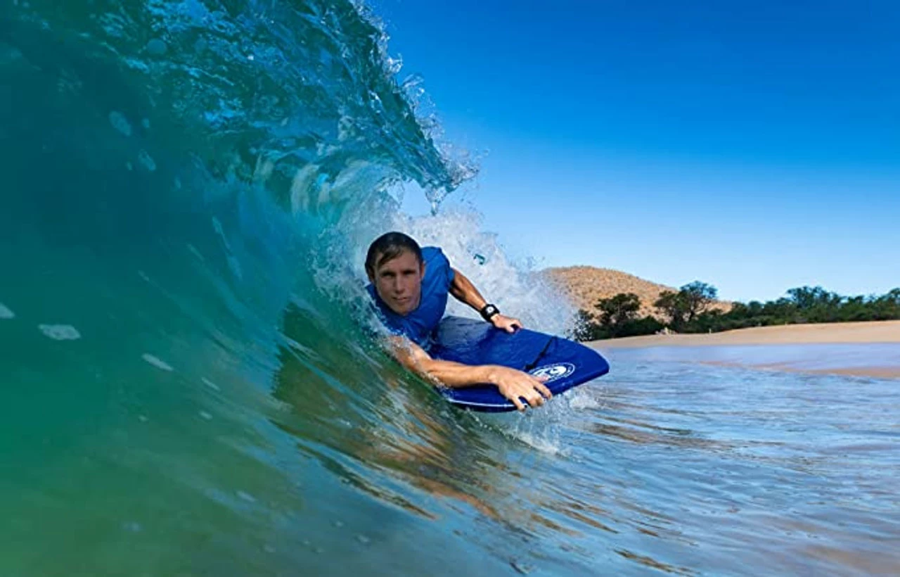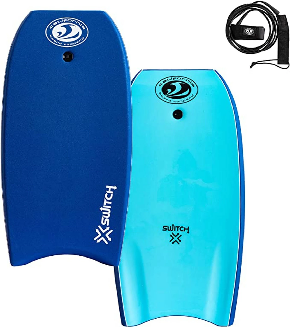 This boogie board from California Board Company will make you feel like a natural rider in the water. Board Features Silk screen graphic (top and bottom) HDPE slick Channels Leash plug Crescent tail PU straight leash Assorted deck colors