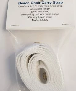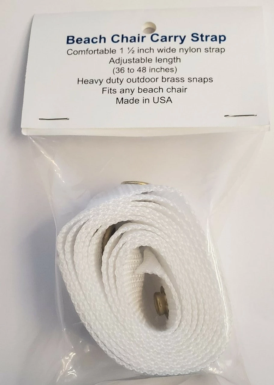 Universal strap designed to fit almost any beach chair, with its adjustable length anyone can use Fits almost any chair – can even add an umbrella Durable brass snaps – doesn't rust, doesn't accumulate sand (like velcro) and doesn't break (like plastic clips). Comes in White Made in the USA *Chair not included*