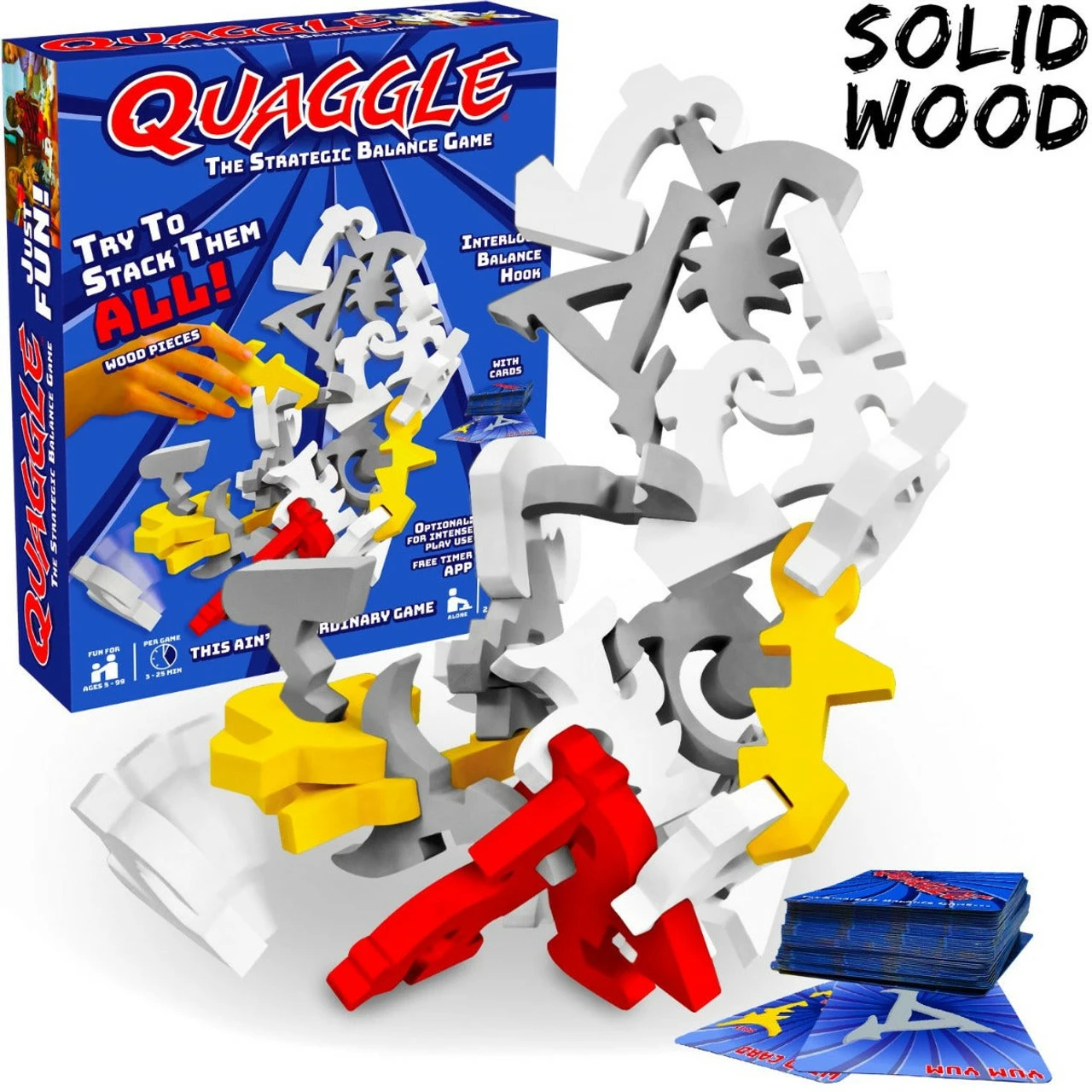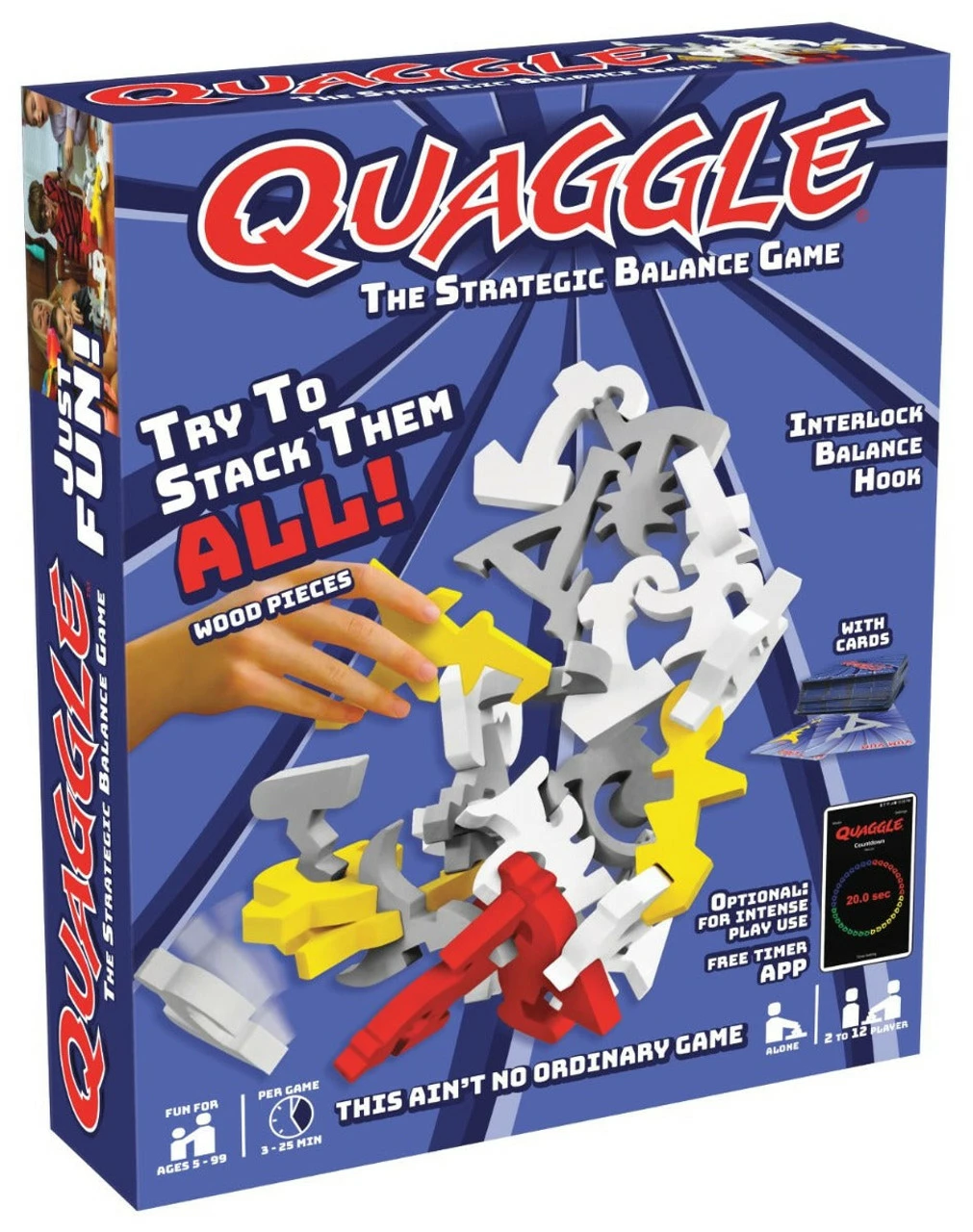 QUAGGLE is an exciting, fast paced and extremely addictive balancing game. Place, interlock or hook your piece and stack your way to the top. One wrong move could send the structure tumbling. Quaggle is an engineering masterpiece combining art, design and physics to create the ultimate stacking game. GAME PLAY: Take turns drawing cards and stack the piece shown, one by one the structure will grow until one person sends it all crashing down! Get the free Quaggle Timer App (iOS and Android) and unlock the full game"™s potential. Exciting gameplay for up to 12 people. Made of solid wood Made for all ages True STEM and STEAM game 4 GAME MODES: Standard with cards 2-6 players | 5-15min per Round | Intensity Level Medium Winning player: Most cards Chill no cards no app 2-8 players | 5-20min per Round | Intensity Level Low Winning player: No winner Countdown with Quaggle unique countdown App 2-12 players | 1-5min per Round | Intensity Level High Winning player: last man standing Quick with Quaggle unique countdown App 2-6 players | 2-10min per Round | Intensity Level High Winning player: Lowest time used
