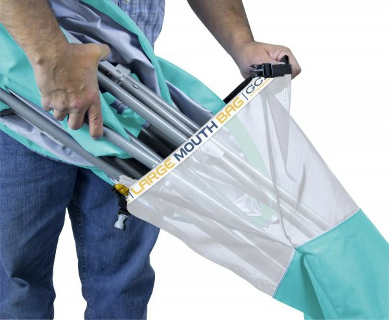 Sit back in this reclining beach chair with canopy, adjust it into one of three reclined positions, rotate the SunShade—and start relaxing! Easily folds up into a carry bag with built-in backpack straps. Locks, unlocks and folds easily with the Tension Bar Stability System™ 3 reclining positions Canopy Built-in beverage holder Breathable Polyester with a Mesh Backrest 50+ SunShade The carry bag rolls up to fit into the patent-pending Pocket Pillow™, converting it to a head pillow for additional comfort! Manufacturer's One Year Limited Warranty