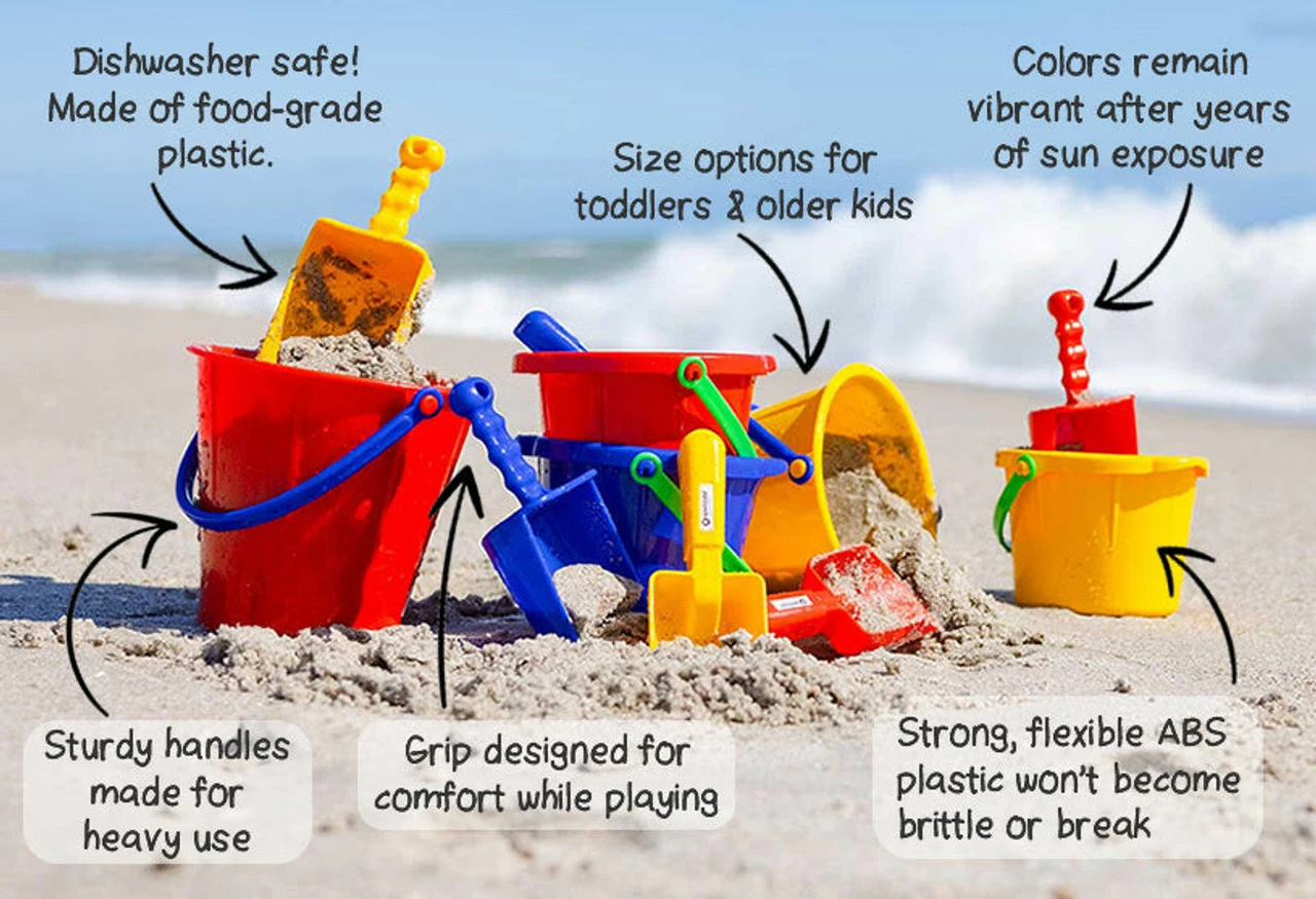 Colorful, indestructible 5pc cup set of nesting cups will delight your little one. The primary colors of this set are vibrant and eye catching. Stack them up one by one, then knock it over! When you're through, nest them into one another. Includes a bucket with handle. PVC Free, Phthalate Free plastic, made in Germany.
