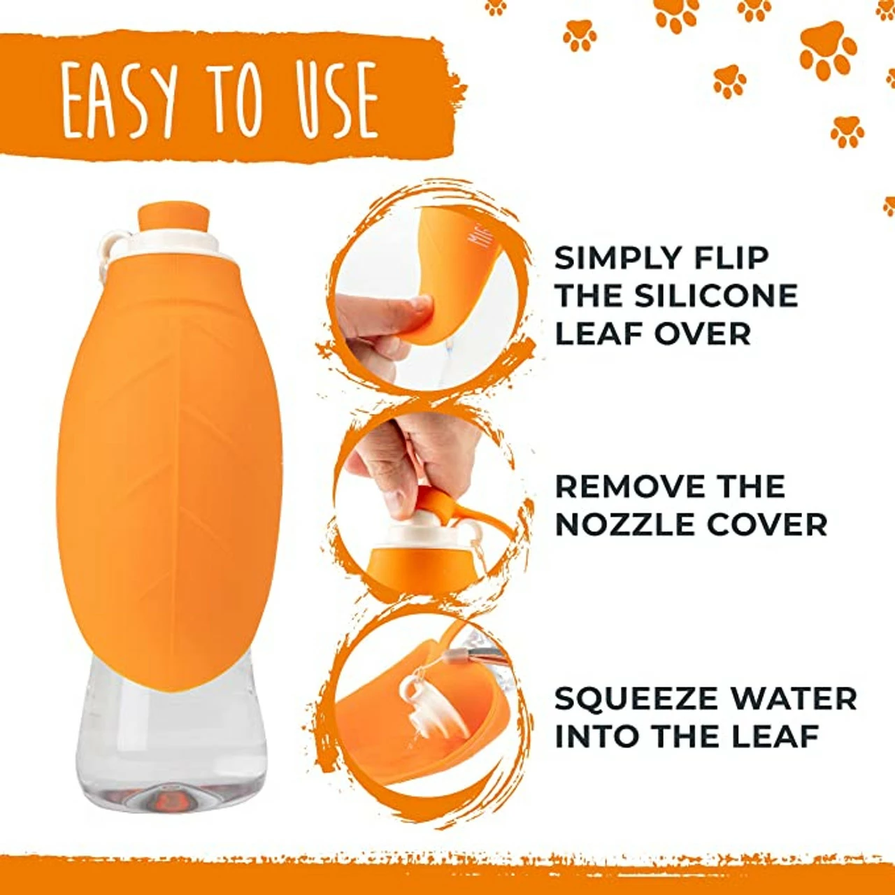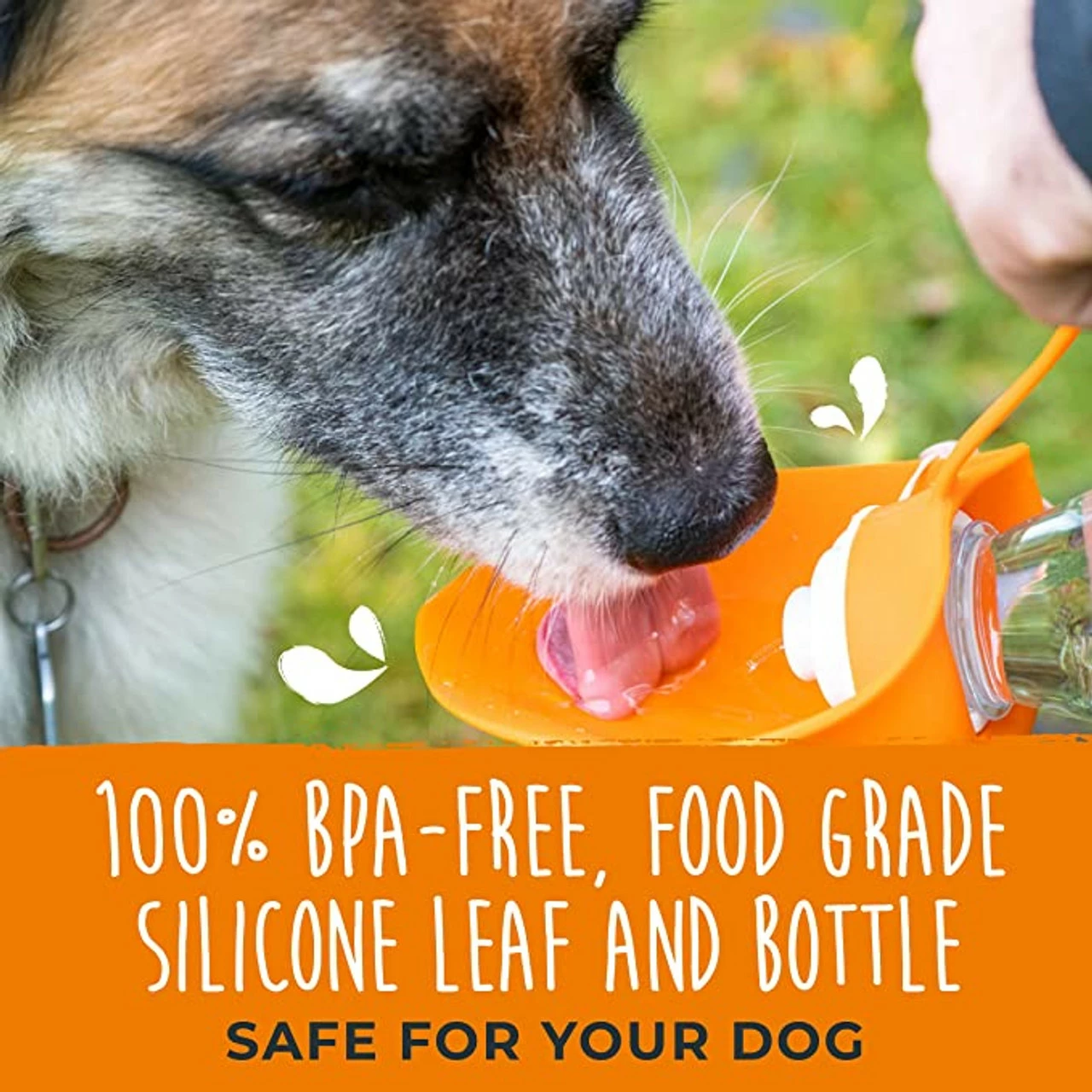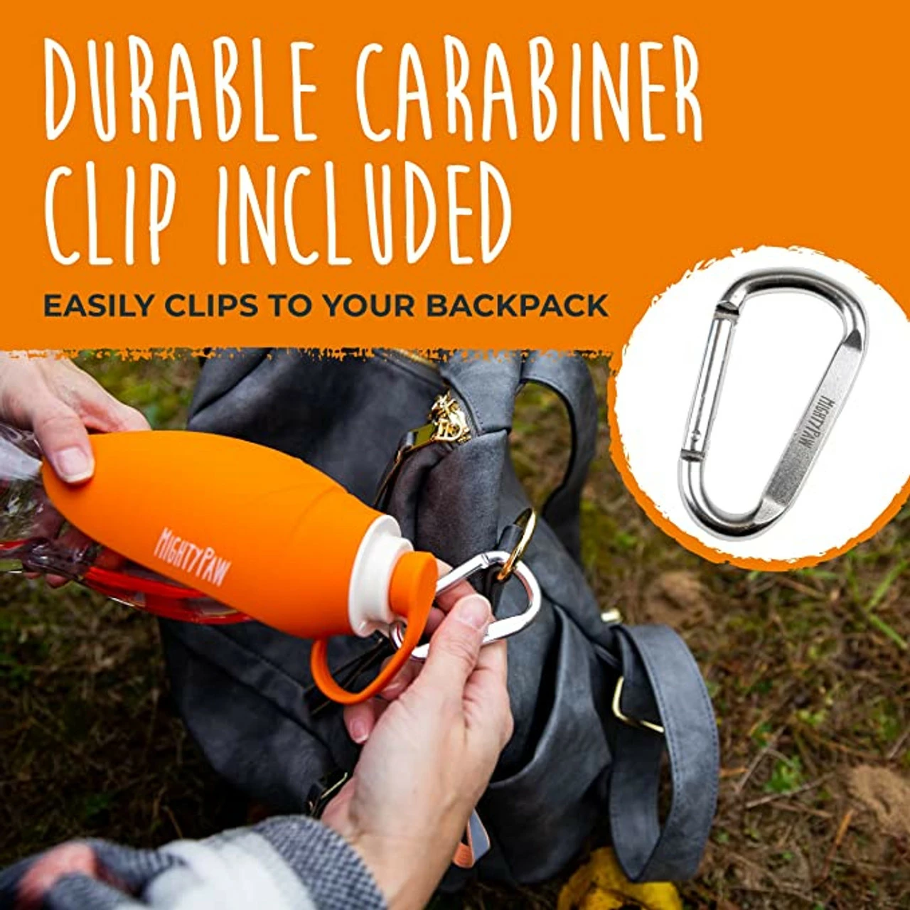 Mighty Paw"™s modern and stylish Travel Dog Water Bottle is made with BPA-free, food-grade silicone that"™s free from harmful chemicals. That makes it perfectly safe for your pup to drink from it! Our reusable travel dog water bottle holds 20 oz of water (590 ml). That makes it perfect for even the thirstiest of pups, small or large! 100% BPA-free, food-grade silicone leaf & bottle Safe to drink while hiking and walking Reusable water bottle Gentle on the environment Leak-proof silicone nozzle cover Prevents messes Soft wrist strap Carry the bottle yourself Durable carabiner clip Clip it to your pup"™s harness or to your backpack Top-rack dishwasher safe Easy to clean Available in 2 bright colors: Orange and Green Holds 20 oz of water Great size for small, medium and large pups