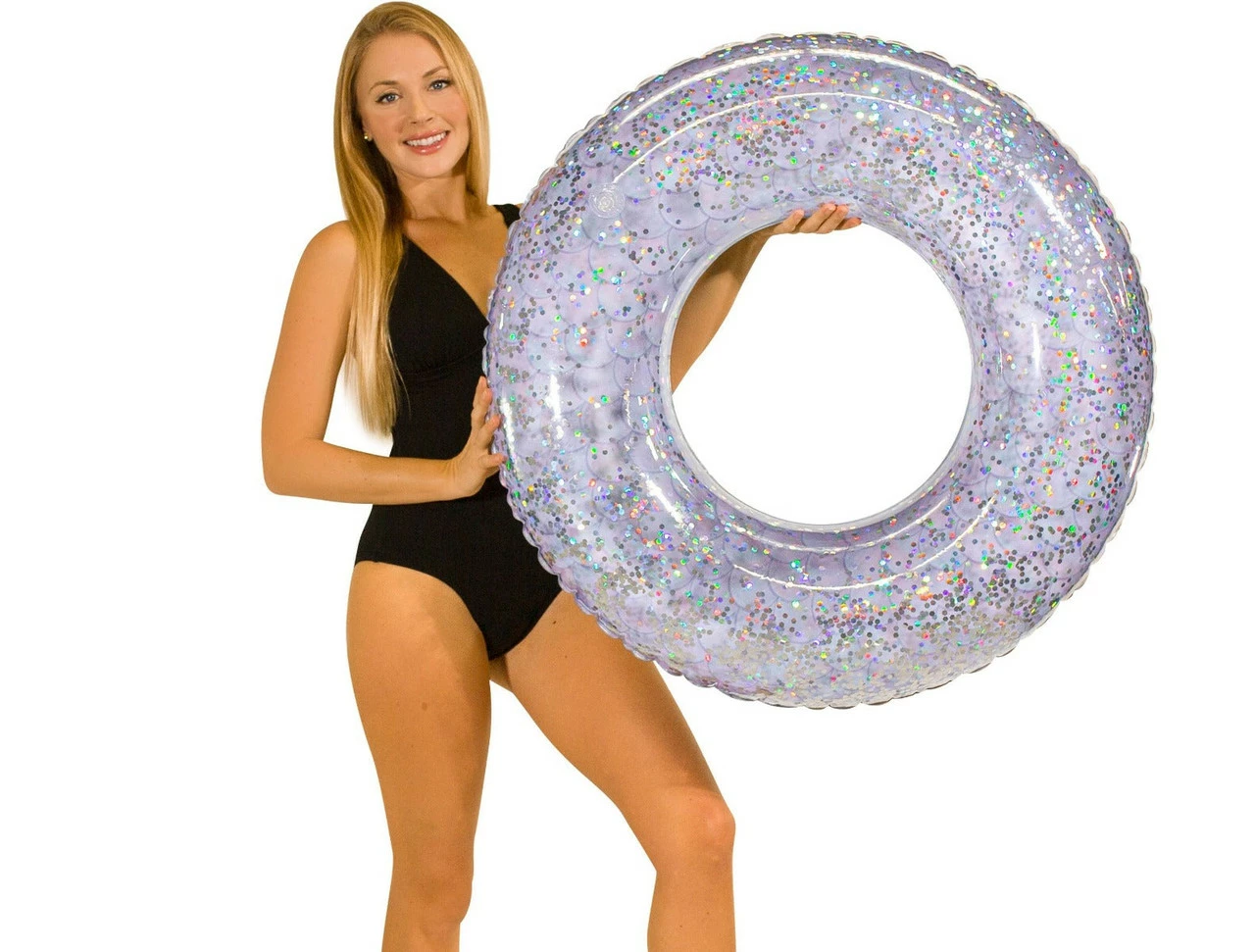 This mermaid themed pool tube will definitely get you pumped to get into the water! Made from PVC. Can support weight of up to 250lbs. 36" diameter Both kids and adults can use.
