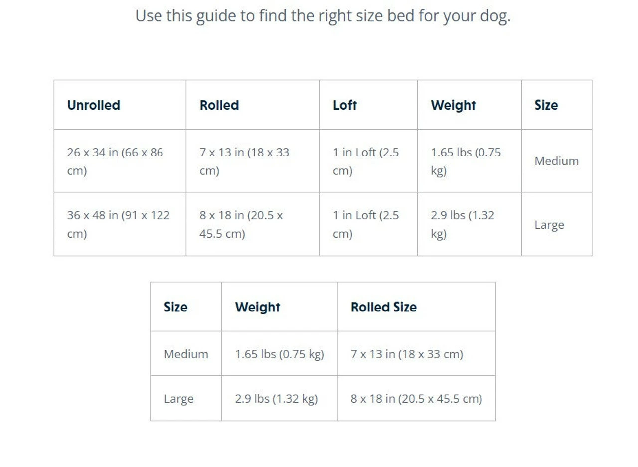 The Mt. Bachelor Pad is a low-profile, portable camping dog bed that gives a sense of home in different environments. Comfortable, warm, recycled polyfill interior Soft, long-wearing, easy-to-clean microsuede sleeping surface Non-slip waterproof base creates a moisture barrier Rolls into a compact, portable bedroll with an integrated strap that stows when not in use 26 X 34 Inches Care Instructions: Secure fasteners Wash in cold water Gentle cycle Mild detergent Air dry Do not bleach, iron, or dry clean