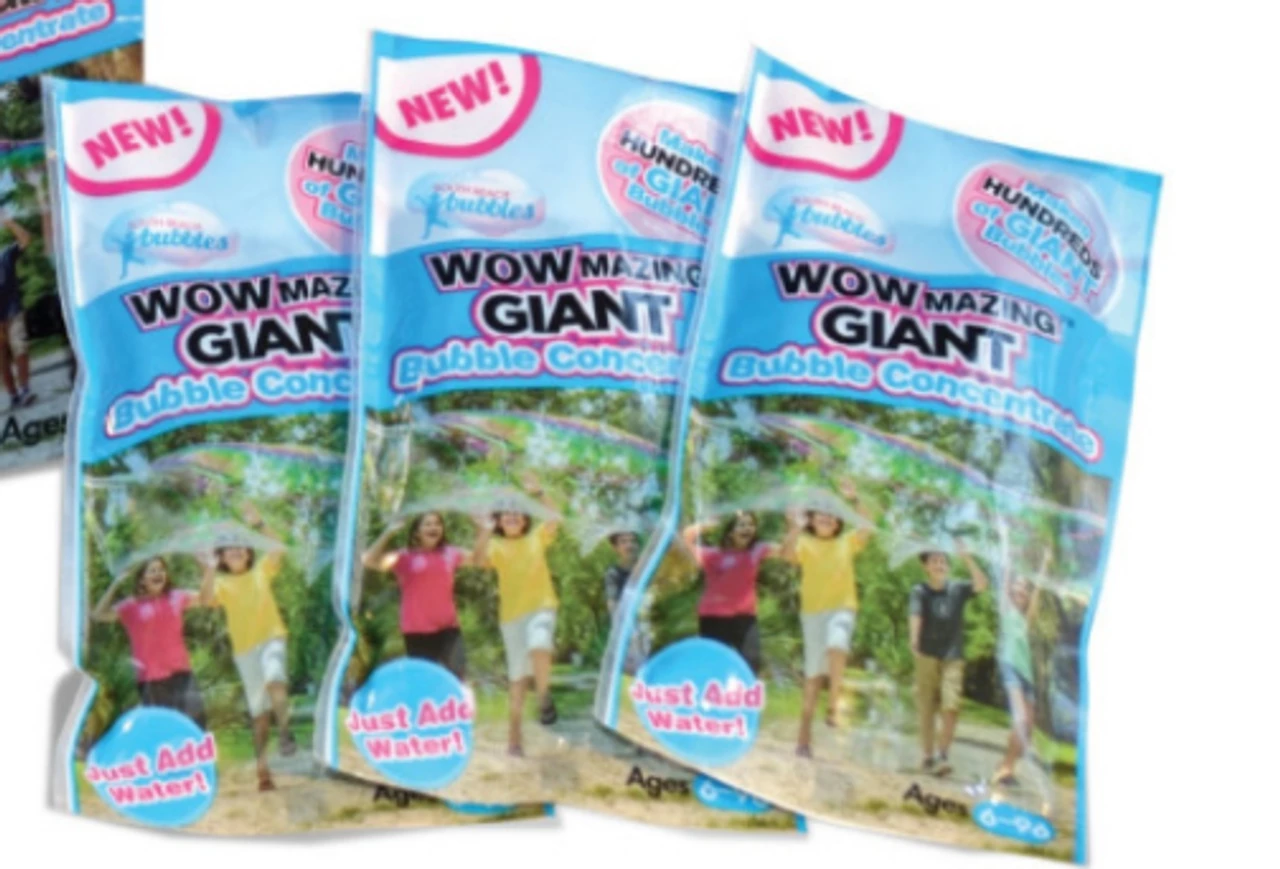 The WOWmazing„ Bubble Concentrate Refill will keep the party going! The WOWmazing Bubble Concentrate was specially formulated for creating giant, high flying and long-lasting bubbles. -Set includes 3 pouches that will make hundreds of WOWmazing bubbles. -Use one pouch at a time. For GIANT bubbles, simply add 1 pouch of WOWmazing Bubble Concentrate to 4 cups of tap water. -For regular size bubbles, add 1 WOWmazing pouch to 12 cups of tap water.-Set includes 3 pouches that will make hundreds of WOWmazing bubbles. -Use one pouch at a time. For GIANT bubbles, simply add 1 pouch of WOWmazing Bubble Concentrate to 4 cups of tap water. -For regular size bubbles, add 1 WOWmazing pouch to 12 cups of tap water.
