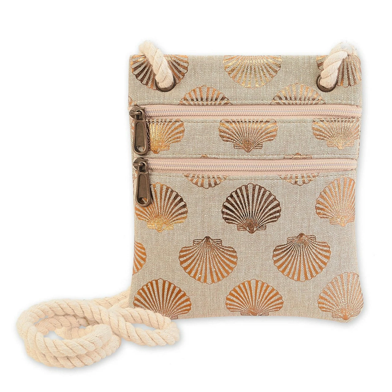 Use this bag as a small casual purse or a cosmentic bag. Shape: Crossbody Design: Metallic Design Exterior Size: 7.5" x 6" x 0" Closure: Zipper Top Strap Drop: Avg: 10" – 12" Material: Beach Canvas Pockets: Interior Lining: Matching Feature: Rope Handle