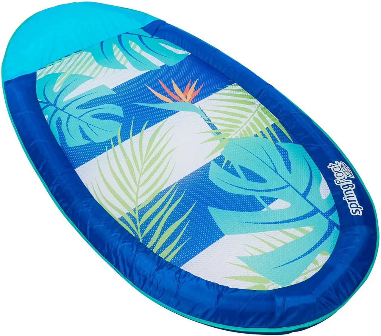 This portable, lightweight and comfortable pool lounge is great to take with you on vacation or use at home in your own pool! Hyper-Flate Valve takes the stress out of setting up and putting away your hammock faster than ever, no pump needed Features patented Inner Spring Technology for greater comfort and stability in the water Soft fabric lining, attached pillow, and cooling mesh cradles your body for ultimate floating relaxation Folds flat into three compact circles for portability and storage (carry bag included) Measures (when fully inflated) 69"L x 35"W x 5.5"H and supports most adults up to 250 lbs. Recommended for ages 15 and up