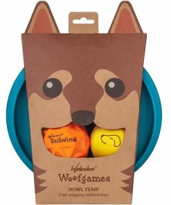 Take your dog out to play all day! The Woofgames doggy play pack includes 3 tail-wagging retrieval toys for air, land, and water play. Dog tested and approved. 3 in 1 dog toy set Perfect for active dogs who love to retrieve 1 Jetwag Disc – a durable, soft rubber disc 1 Tailwind ball – a high bouncing, ultra durable ball 1 Fetch ball – a water bouncing ball for the lake or ocean